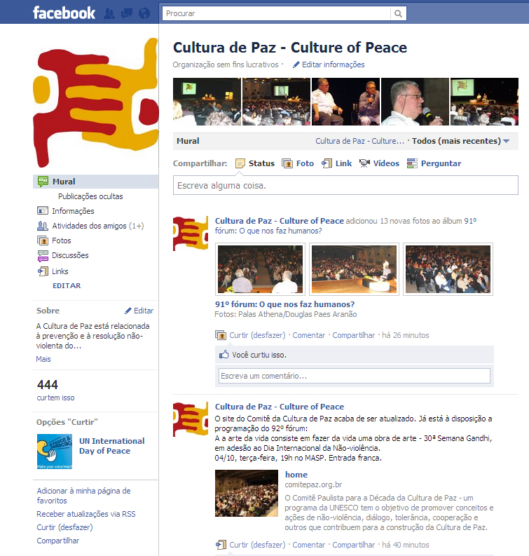 Além do site e deste blog, Comitê da Cultura de Paz mantém sempre atualizada sua página no Facebook. As fotos dos fóruns estão postadas em álbuns que possibilitam download, e é possível deixar comentários e sugestões no mural.Para acessá-la, clique aqui.