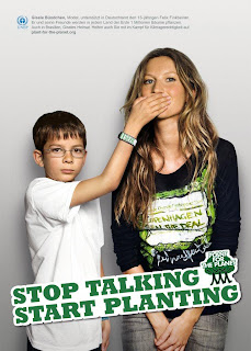 Seus amigos toparam a provocação. Inspirados pelo exemplo da queniana Wangari Maathai, ganhadora do Prêmio Nobel da Paz em 2004, o movimento “Plante para o Planeta” chegou a outras escolas da Baviera, da Alemanha e da Europa. Adultos descolados viram que o menino tinha garra e resolveram apoiar a iniciativa. Uma agência de publicidade alemã ajudou a criar a campanha “Pare de Falar, Comece a Plantar”, desenhando uma imagem que poderia ser reproduzida por qualquer ativista mirim ao lado de uma autoridade ou celebridade. A mão direita do menino ou da menina deve tapar a boca do adulto! A modelo brasileira Gisele Bundchen, engajada na causa ambiental, topou ficar calada (foto acima).